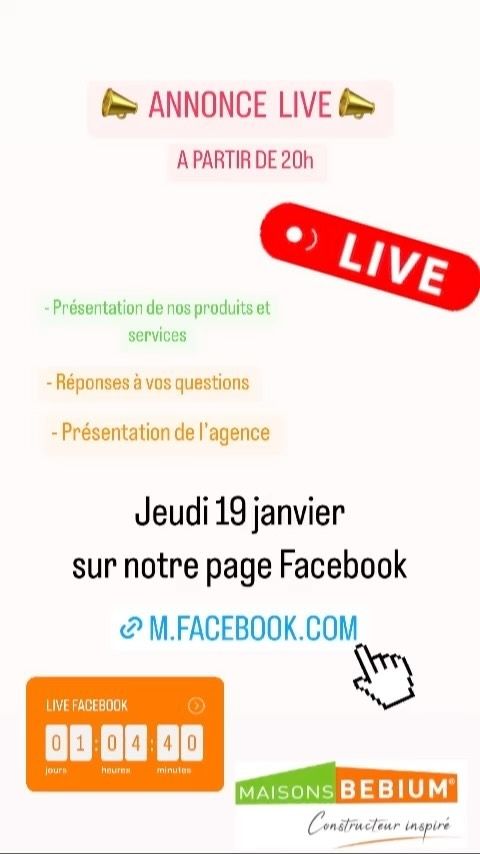 Retrouvez-nous le jeudi 19 janvier à partir de 20H en direct de notre page FB Maisons Bebium Clermont-Ferrand.